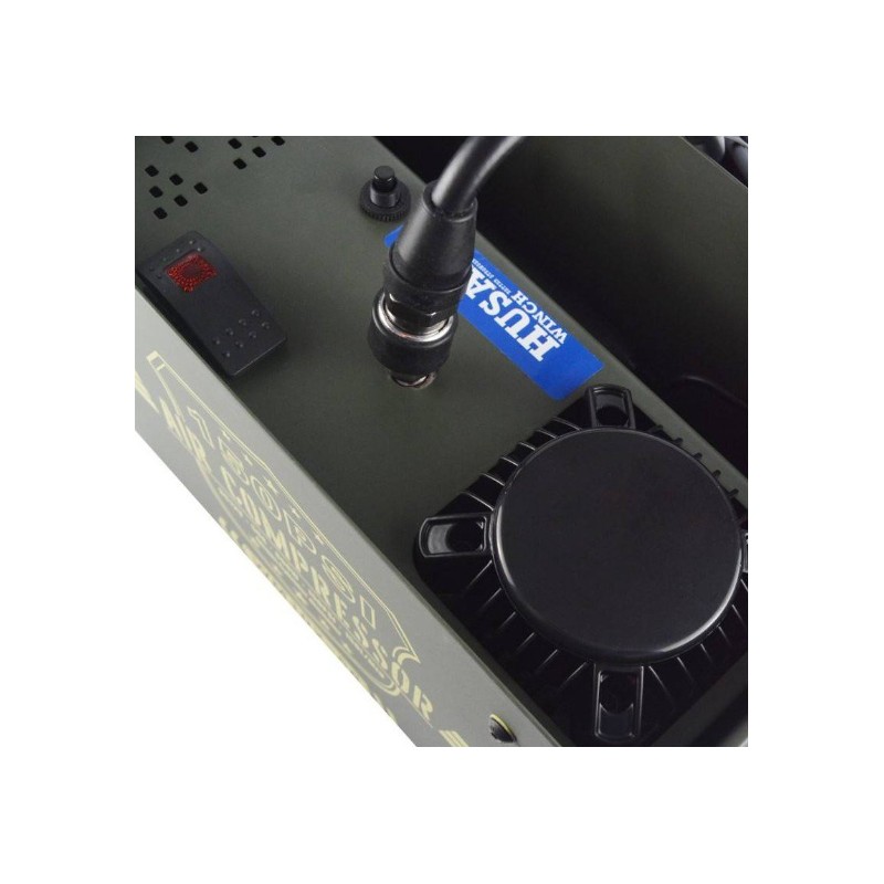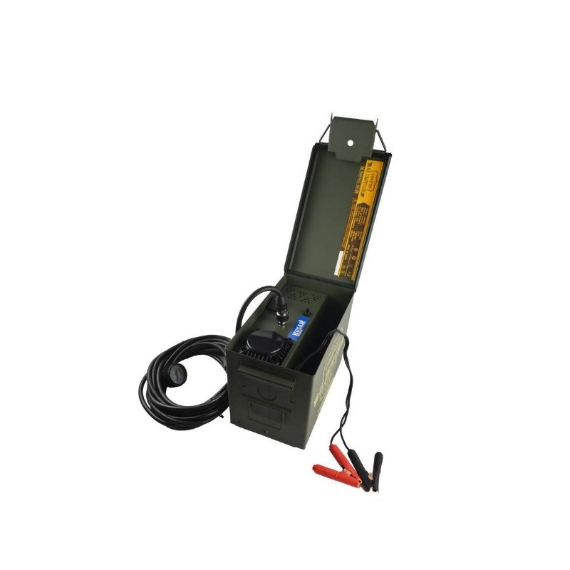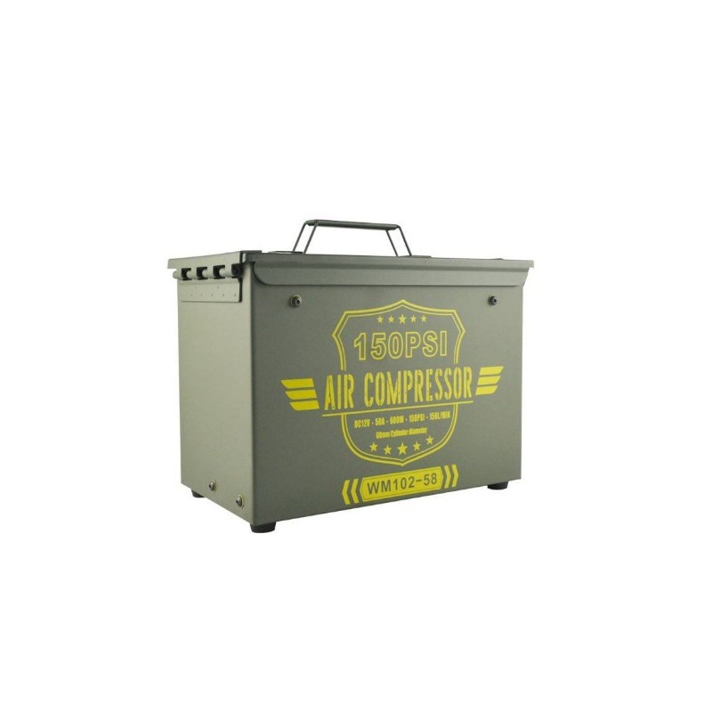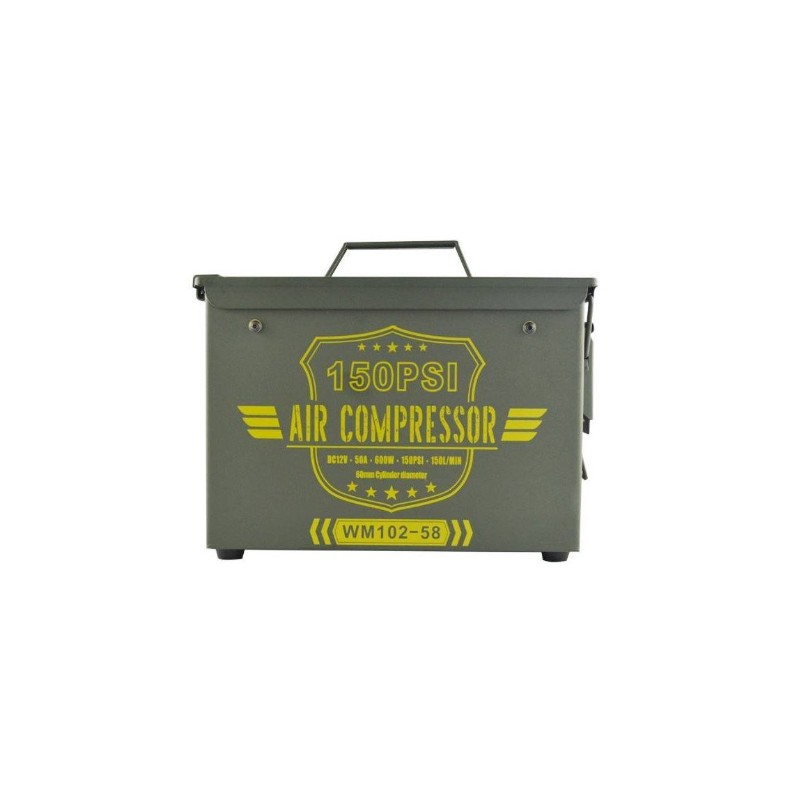 Compresor de aire 12v de 150 litros/minuto en caja militar.Válvula de descarga por presión superior a 150psi,manguera de 8 metros con manómetro,incluye varias bocas,50Ah,peso 11kg.