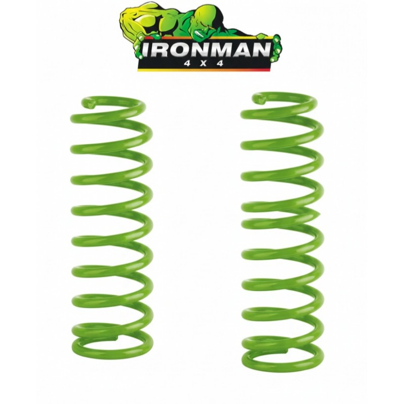 Todos los muelles Ironman® han sido cuidadosamente diseñados para una conducción segura y confortable,al mismo tiempo ofrecen mayor elevación del vehículo con respecto al suelo.Los muelles Ironman® están hechos a partir de la mejor aleación de acero,silicio y manganeso disponible en el mercado.Todos los muelles son probados antes de su producción masiva.