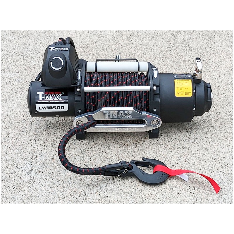 Cabrestante T-MAX FIREWORK SERIES 18500 24v uso industrial,servicio pesado,capacidad de arrastre 8.390kg,cable sintético enfundado de 14mm x 25m,relación 473:1,mando por cable,embrague anillo telescópico Axial,freno automático en tambor,tensor de cable,protección contra sobre carga,peso 53kg,medidas:647 x 214 x 214mm.