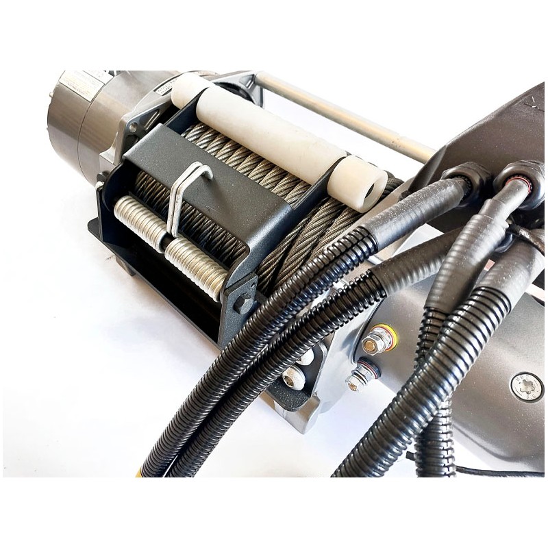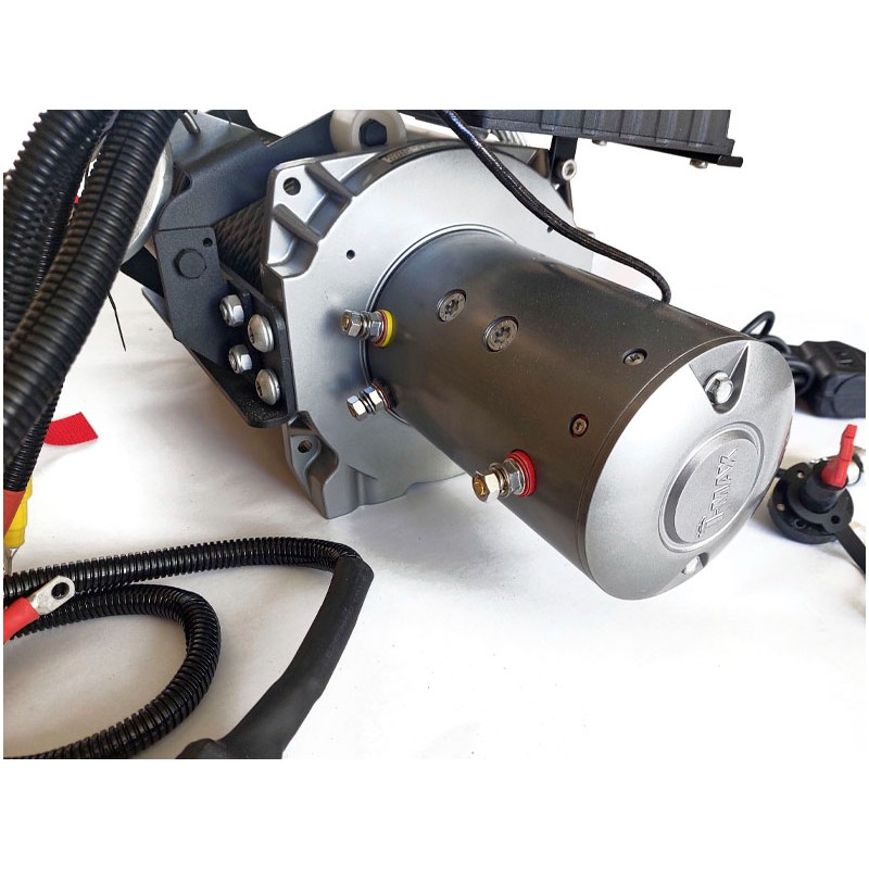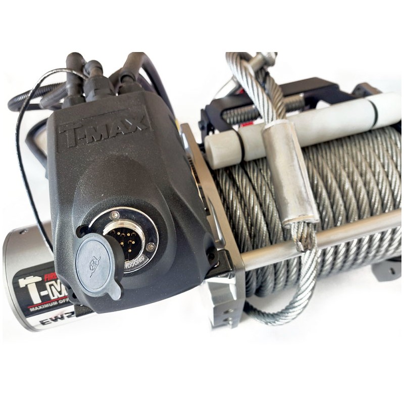 Cabrestante T-MAX FIREWORK SERIES 22500 24v uso industrial,servicio pesado,capacidad de arrastre 10.206kg,cable acero de 13mm x 28m,relación 504,9:1,mando por cable,embrague anillo telescópico Axial,freno automático en tambor,tensor de cable,protección contra sobre carga,peso 70kg,medidas:645 x 215 x 214mm.