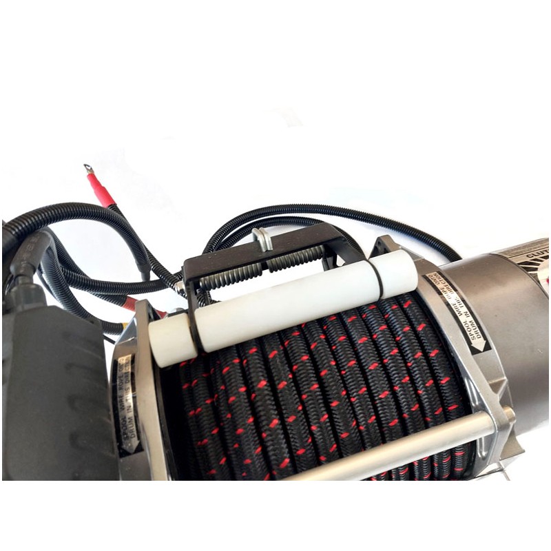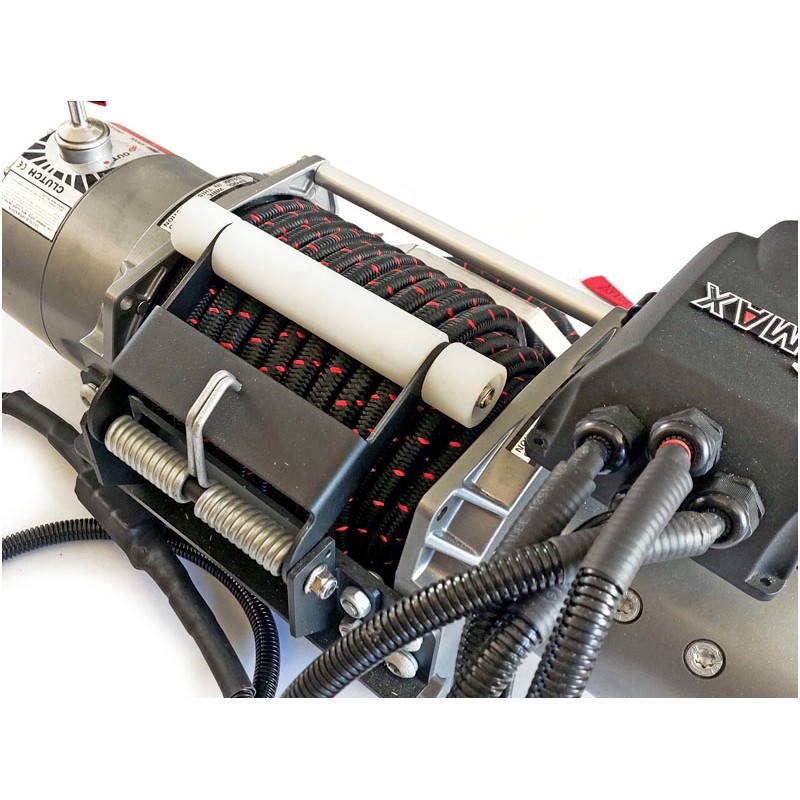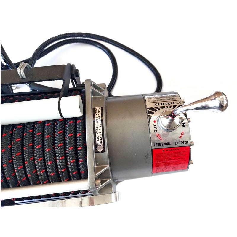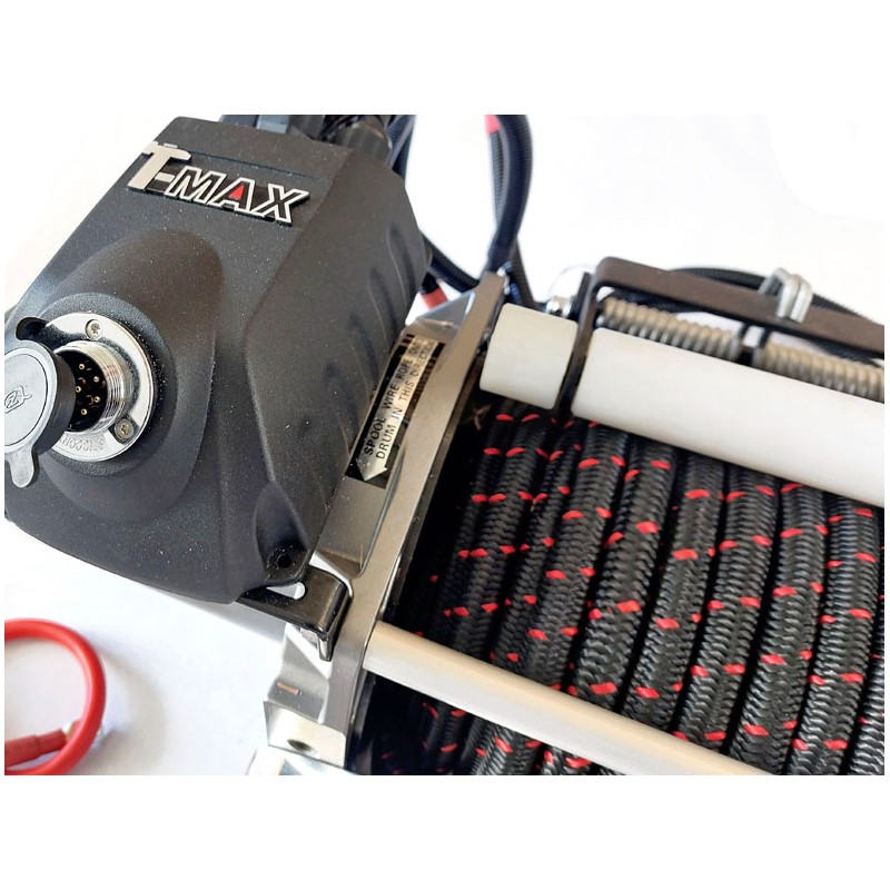 Cabrestante T-MAX FIREWORK SERIES 22500 24v uso industrial,servicio pesado,capacidad de arrastre 10.206kg,cable sintético enfundado de 16mm x 22m,relación 504,9:1,mando por cable,embrague anillo telescópico Axial,freno automático en tambor,tensor de cable,protección contra sobre carga,peso 54kg,medidas:645 x 215 x 214mm.