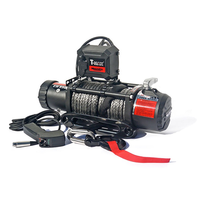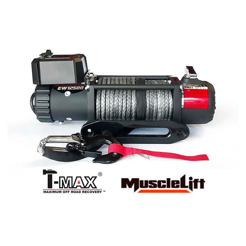 Cabrestante T-MAX MW12500 Muscle-Lift 12v cable sintético de 11mm x 27mts,capacidad de arrastre 5.665kg,indicado Off Road,mando por cable de 3,7m,relación 193,2:1,peso 27,6kg.Cumple la norma de resistencia al agua IP67.