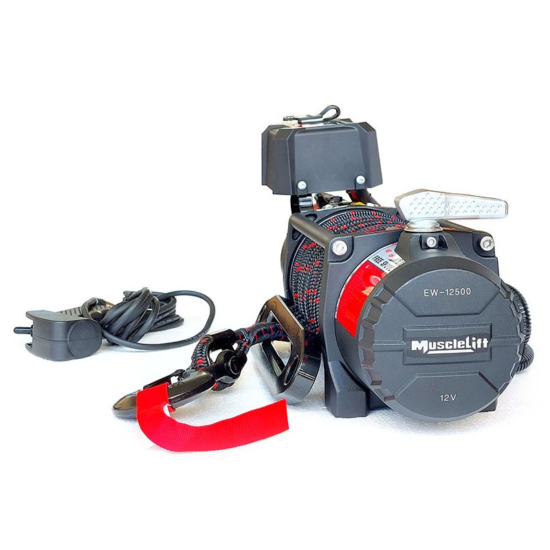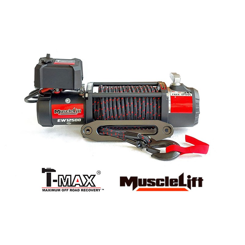Cabrestante T-MAX MW12500 Muscle-Lift 12v cable sintético enfundado de 11,5mm x 22mts,capacidad de arrastre 5.665kg,indicado Off Road,mando por cable de 3,7m,relación 193,2:1,peso 27,6kg.Cumple la norma de resistencia al agua IP67.