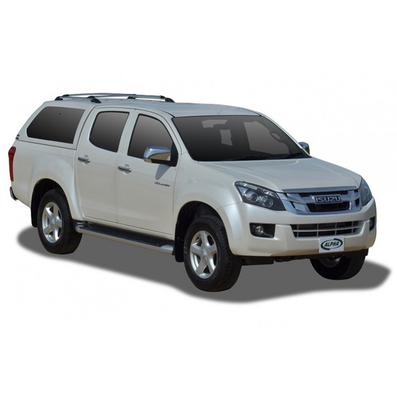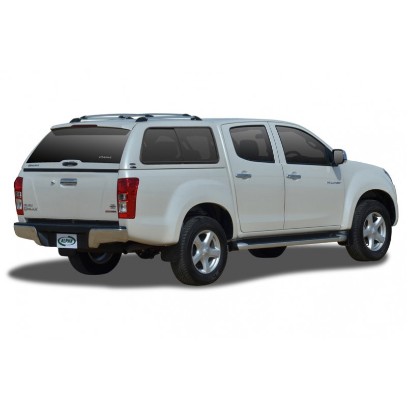 Hard top ALPHA GSE con ventanas para ISUZU D-MAX 2012-2020 doble cabina,fabricado en fibra,cierre de seguridad con llave,luz interior, tercera luz de freno y barras de techo incluidas.Ventana de acceso a cabina OPCIONAL.