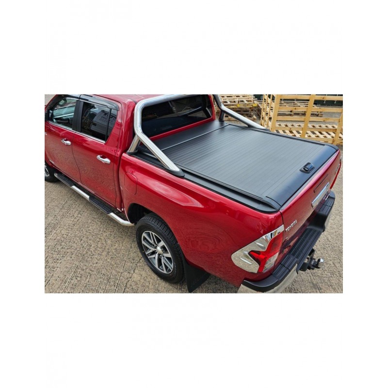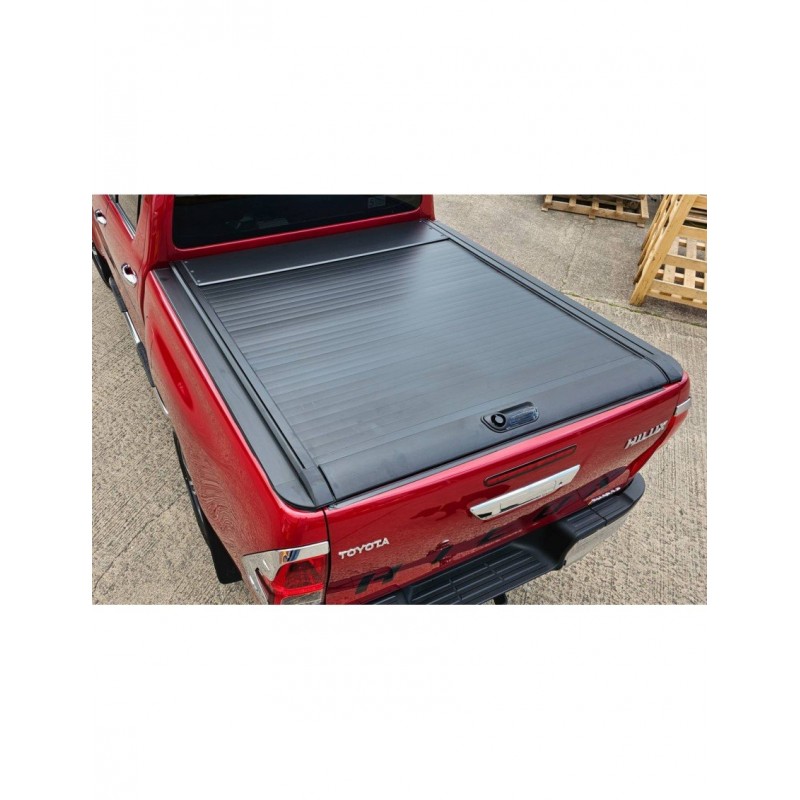 Persiana enrrollable manual AFRIKAAN para TOYOTA HILUX REVO DOBLE CABINAdesde 2015.Color negro mate,permite dejar la persiana medio abierta,abierta completa o cerrada,con evacuadores de agua,maneta reforzada con llave de seguridad.